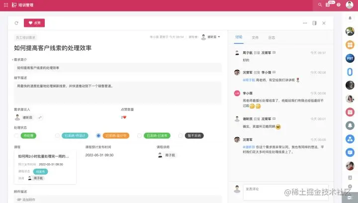除了上图展示的需求之外,员工同样可以对每一个课程、每一次考核进行讨论,在培训课程设计阶段、开始之前、结束之后都可以进行讨论和反馈,不再局限于课堂。