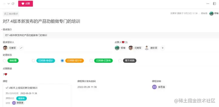 如上图所示,员工可以在需求池这里提交和管理自己的需求,并能够查看到其他同事提交的需求,也能非常清晰地知道自己反馈的需求是否被采纳,已采纳的需求到哪一步了,是还未开始设计课程、还是正在设计中,以及课程预计发布的日期。
