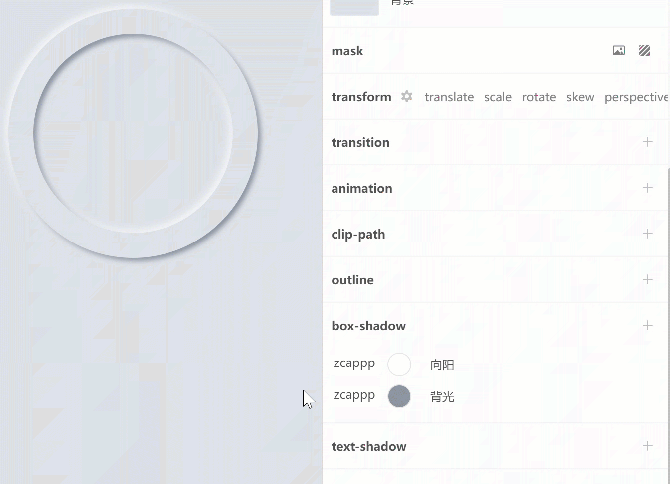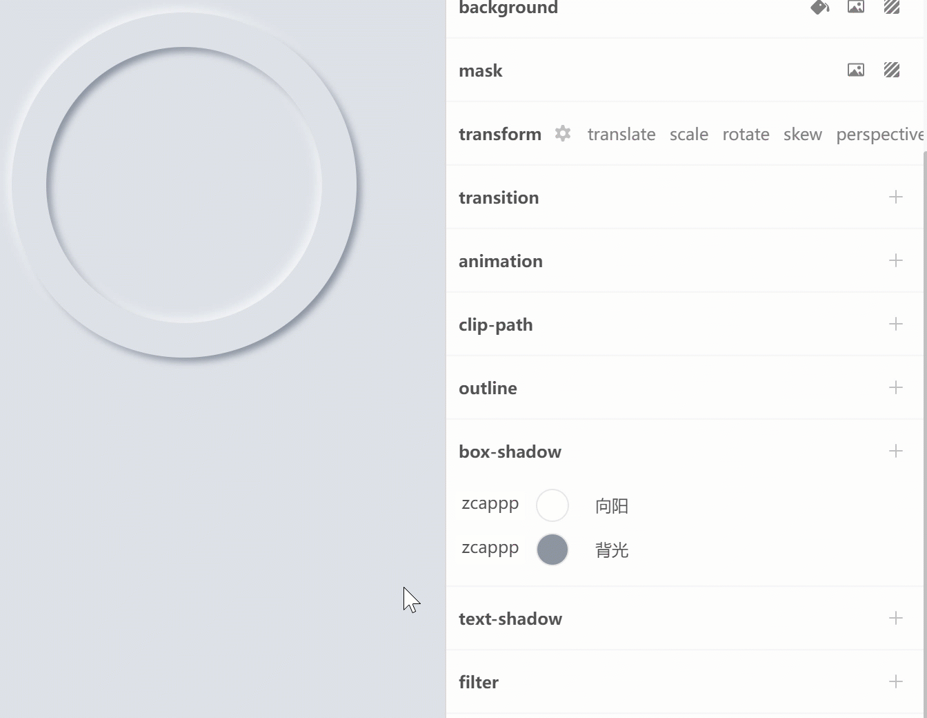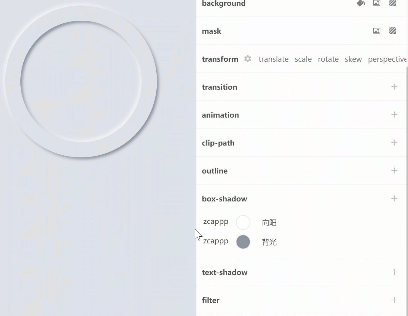 新拟物设计(Neumorphism)关键是使用了两层阴影,一层高亮阴影(向阳面背光),一层暗色阴影(背光面),以及设置元素的背景颜色。凸的时候(outset)高亮影在左上,暗色在右下,凹时(inset)反过来。