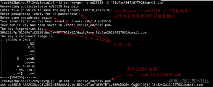 在终端输入 ssh-keygen -t ed25519 -C "密钥名称" ,回车三次便生成了密钥,通过查看 ~/.ssh/id_ed25519.pub 文件获取公钥。