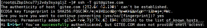 将公钥确定保存成功后,在终端输入 ssh -T git@gitee.com ,首次添加需要键入 yes ,看到 successfully 字样,则表明添加成功。