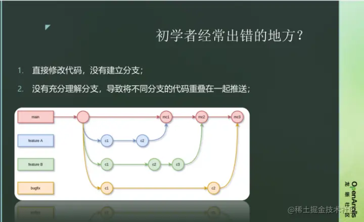 需要注意的是,初学者经常在 Git 命令上出错。常见的原因一般是:原本应该放在不同分支上修改的内容,却被放到了相同的分支上修改,相当于重叠了,这样将会与同时提交的小伙伴产生冲突。