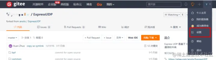 Gitee 平台中会有记录,你会看到这个代码仓是“forked from”上游的代码仓。当拿到了自己的代码仓以后,就可以进行 Clone 操作,选择 HTTPS 或者是 SSH。如果选择了 SSH 的话,需要配置自己的密钥,密钥的配置在如下图所示位置。