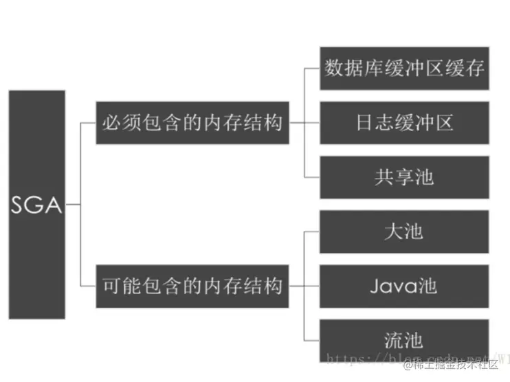 如图所示,Oracle实例结构分为左右两部分,一个叫做SGA,称作系统全局区;一个叫做PGA,称作程序全局区。SGA是系统分配的一组共享的内存结构,用来实现对数据库数据的管理和操作;PGA是用户会话专有的内存区域,每个服务进程、后台进程都有一个PGA。其实从上图可以看出,实例和数据库本来是八竿子打不到一起的两个东西,但是正好中间出来一个媒婆:实例的后台进程,也就是图中示例部分椭圆形一块一块的那个将两者沟通到了一起。下面先对SGA进行分析描述,其中也会涉及到相对应的进程也将进行分析: