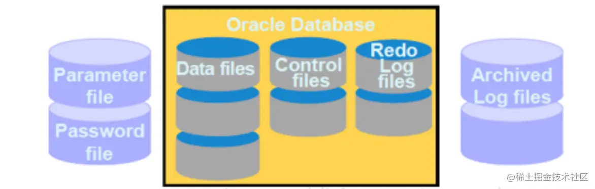 黄黄的部分代表着Oracle的核心组成,分别是数据文件、控制文件以及重做日志文件。除此之外,物理存储结构还包括着一些其他文件,例如参数文件、密码文件以及归档日志文件等等。下面将主要介绍这些文件。