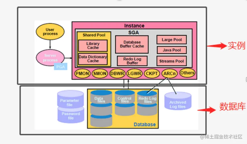 如你所见,以中间空白的为线,上面粉嫩嫩的部分便是Oracle实例部分,下面的便是数据库部分,那接下来我们便逐个进行剖析。