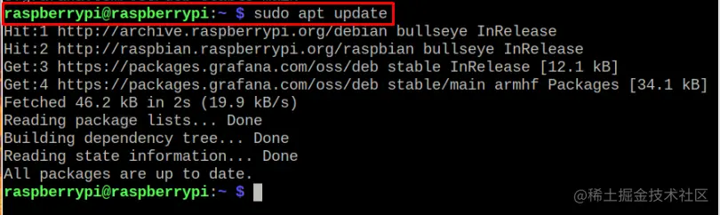 在添加Grafana软件库后,执行下面的命令来更新Raspberry Pi软件包列表。