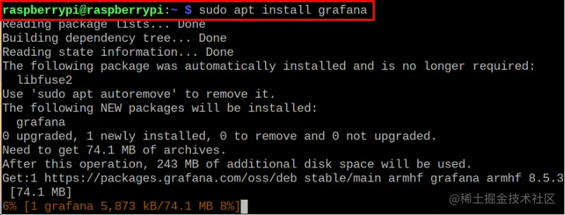 一旦仓库被添加,你现在就可以通过以下命令在Raspberry Pi上安装Grafana了。