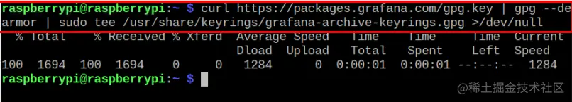 $ curl packages.grafana.com/gpg.key |gpg--dearmor | sudo tee /usr/share/keyrings/grafana-archive-keyrings.gpg>/dev/null