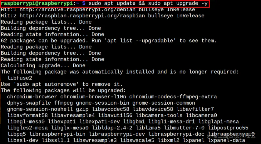 首先,我们建议你通过以下命令更新Raspberry Pi设备上的软件包。