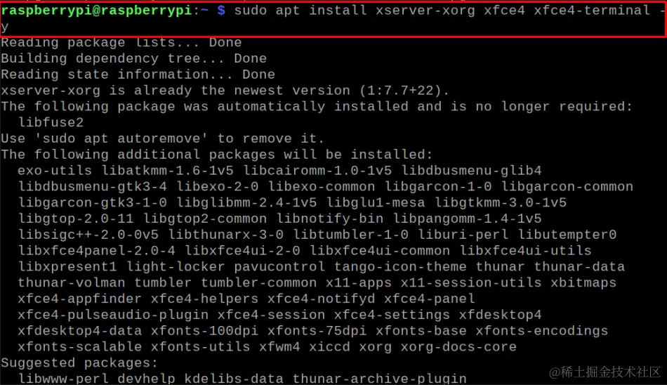 如果你的设备上使用的是轻量级的Raspberry Pi操作系统,你将需要先安装桌面环境,这样你就可以使用GUI。下面给出的命令将帮助你在设备上安装Xfce环境。
