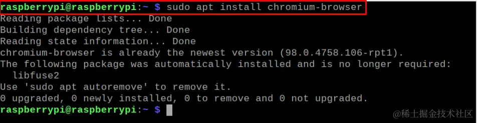 树莓派操作系统已经包含了Chromium浏览器,所以在浏览器已经安装的情况下,你可以跳过这一步。但是,如果你不小心删除了浏览器,请通过以下命令安装它。