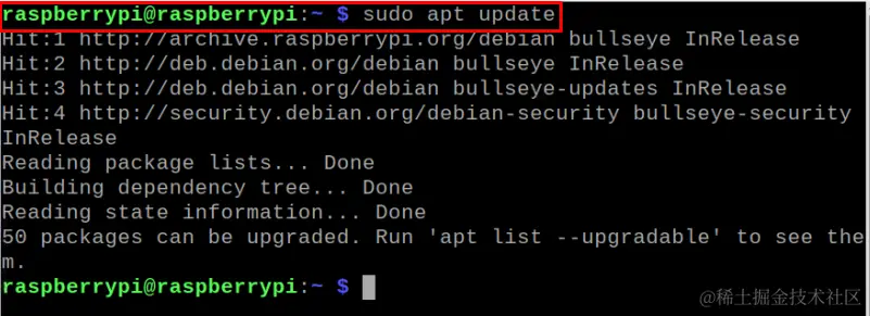 首先,使用以下命令更新Raspberry Pi的软件包。