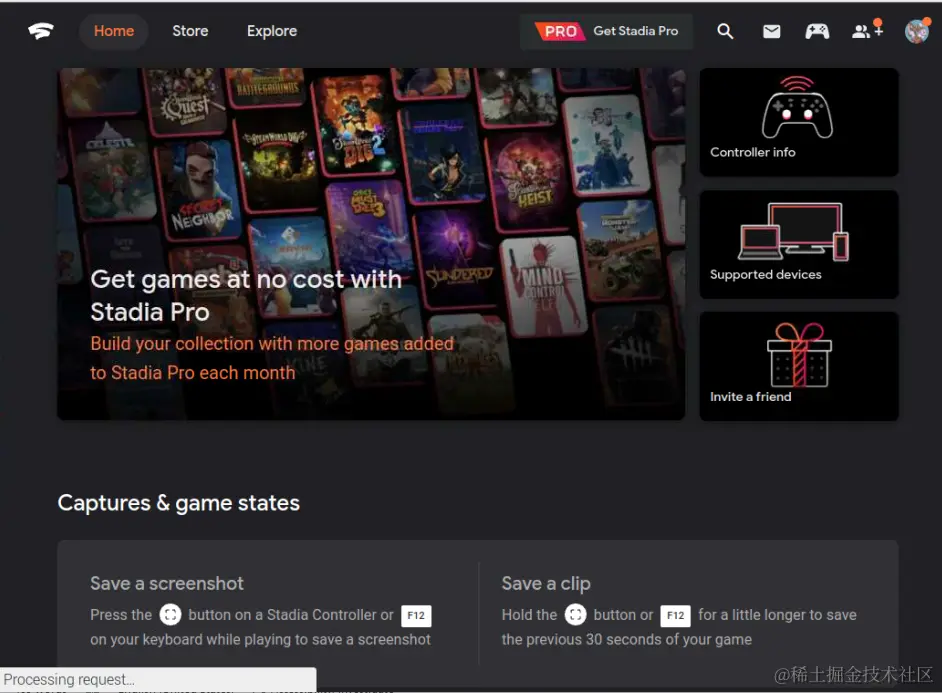 这显示了浏览器上的Stadia仪表板 。