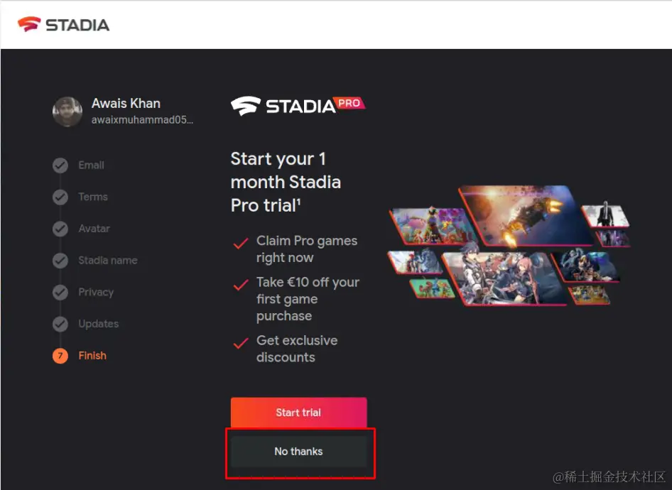 第8步:在这一步,你需要购买Stadia 专业版,这样你就可以享受在上面玩游戏了。为此,请点击 "开始试用"选项,并提供您的账户信息。
