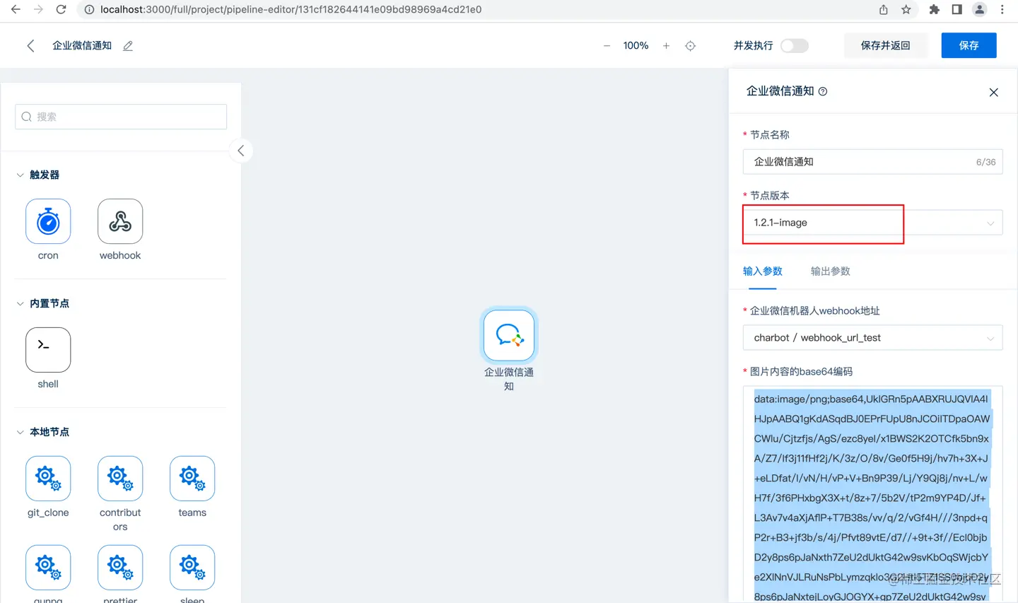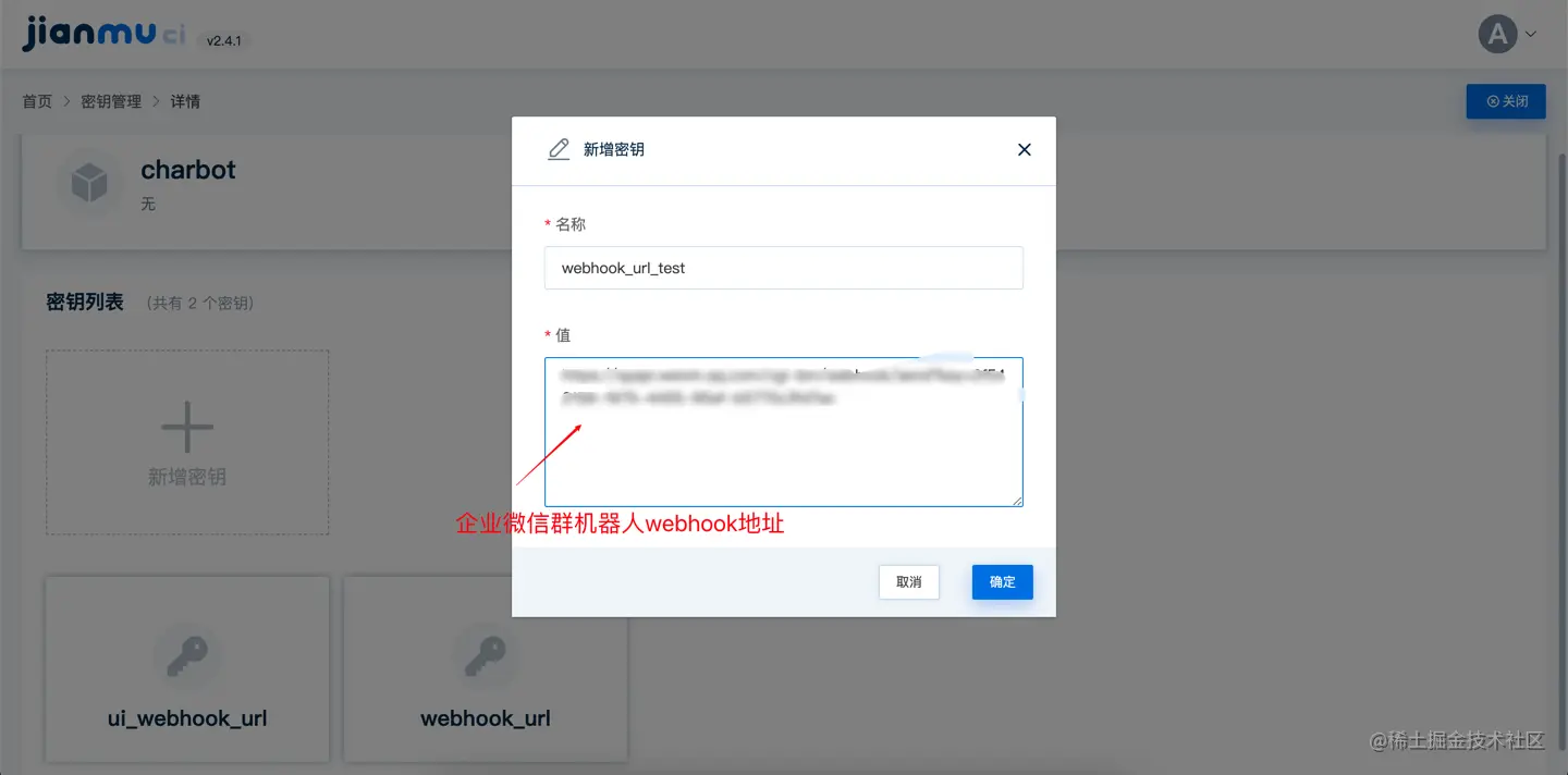 将机器人的webhook地址保存在charbot密钥空间下,便于之后在节点中使用。