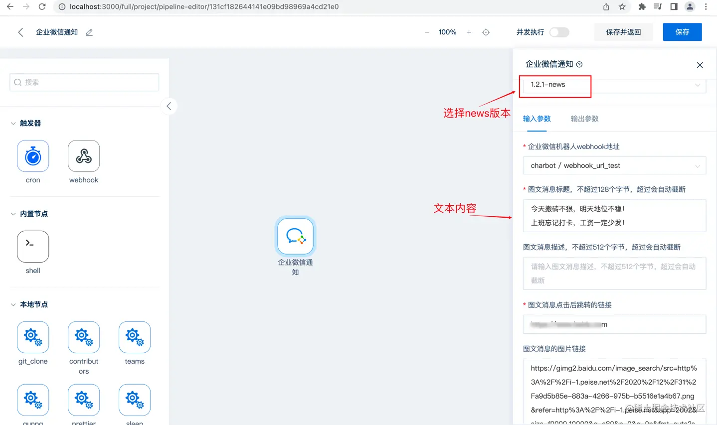 这里企业微信节点提供了四种格式的消息,可以按照需求对应选择:
