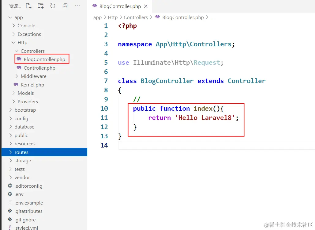 页面内容中显示 Hello Laravel8 就代表我们完成了从路由到创建控制器的操作。