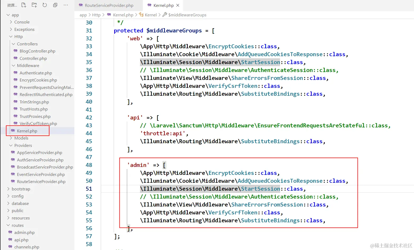 这就需要你在 启动文件中 定义 admin 中间件组了。