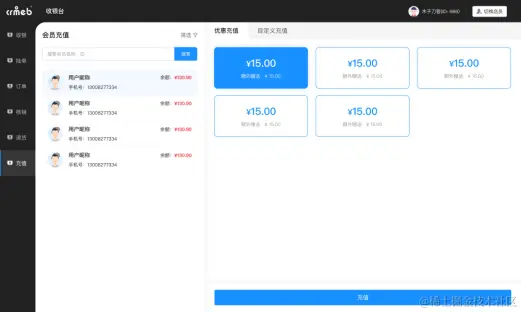充值界面中包含所有会员的基本信息、充值余额等,店员可以直接在这个界面为顾客进行充值,平台设置有 5 档不同的充值套餐,并匹配有一定的赠送活动。