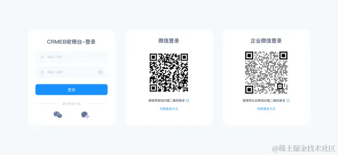 此次,CRMEB Pro v2.2 丰富了收银台账号登录功能,在之前账号密码登录的基础上,添加了微信、企业微信扫码登录功能,而且,这 3 种账号登录方式的账号信息可以实现同步,极大方便了门店的使用。