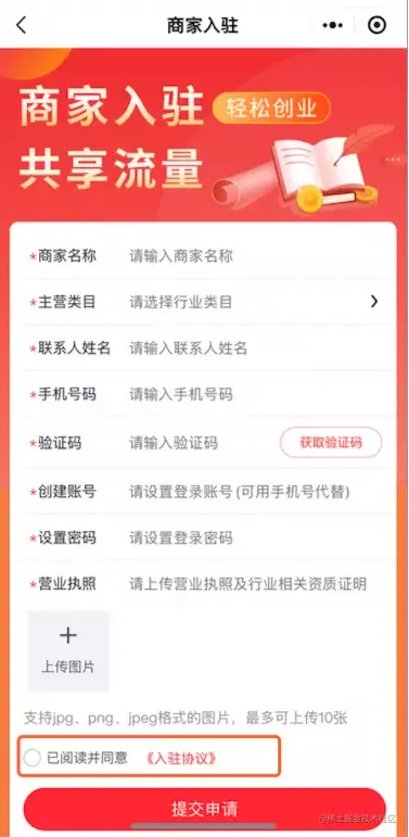 为了避免潜在的平台与商家经营、法律纠纷,平台需要提前设置好商家入驻协议,商家同意协议才能提交入驻申请。