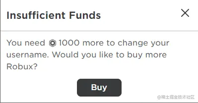 如果你的账户中有1000个Robux,那么它会要求你输入新的用户名,否则你会看到一个弹出窗口,如下图所示。