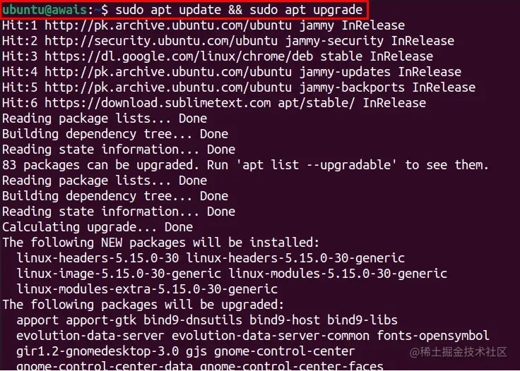 首先,使用以下命令更新Ubuntu系统上的软件包。