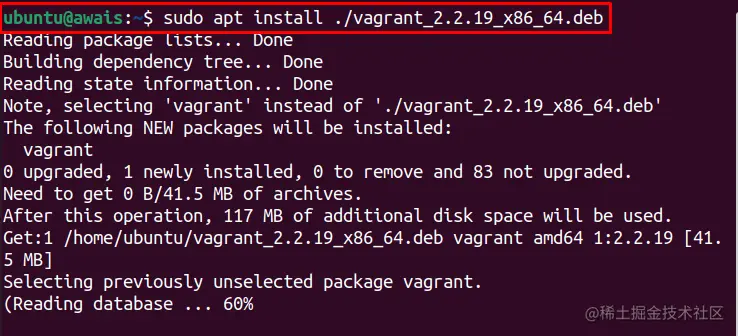 $ sudoaptinstall./vagrant_2.2.19_x86_64.deb