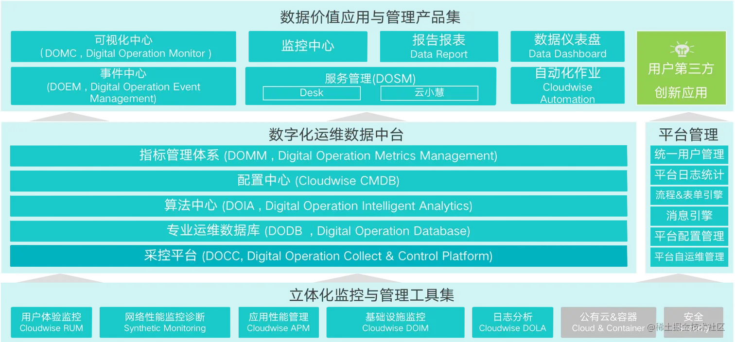 该平台由立体化监控与管理工具集、数字化运维数据中台和数据价值应用与管理产品集组成。其中,立体化监控与管理工具集从基础设施、应用性能到用户体验,涵盖从业务到基础设施的各个监控层面,帮助用户构建从技术到业务的完整监控体系。