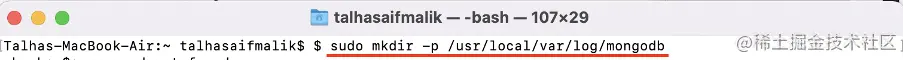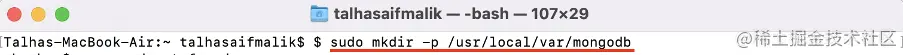 **第8步:**现在为MongoDB创建目录以写入日期(对于macOS 10.15 Catalina及以上版本)。