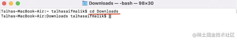 第3步: 使用cd命令改变目录到下载MongoDB tar文件的路径。在我们的例子中,该文件是在Downloads 目录下。