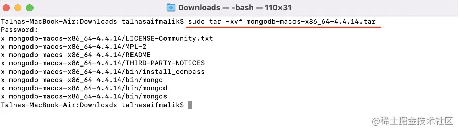 $ sudo tar -xvf mongodb-Macos-x86_64-4.4.14.tar