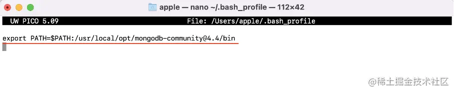 如果由于某些原因mongo命令不能工作,那么可以尝试在bash_profile文件中添加一个路径。用nano编辑器打开该文件。