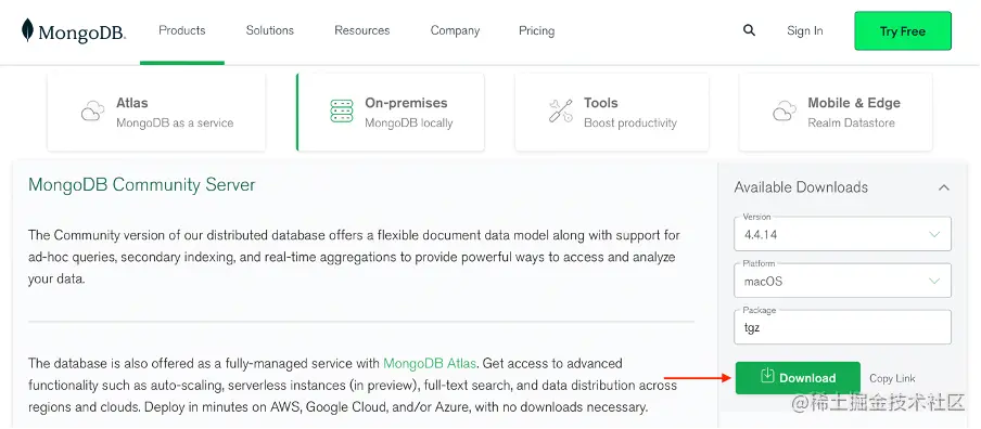 **第一步:**进入MongoDB网站的社区下载页面,下载MongoDB。你也可以选择其他版本的MongoDB。