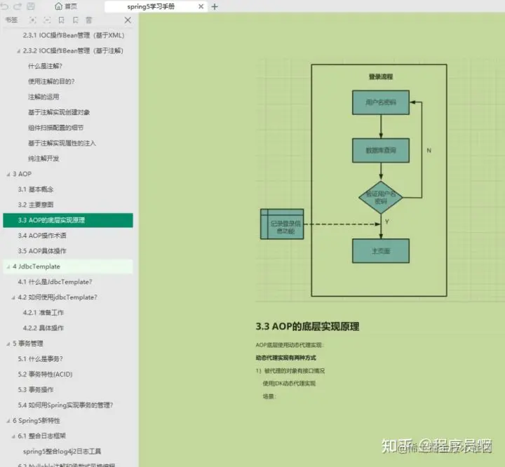 以上所绘的Spring5的架构脑图其实就是对这份Spring5学习手册的理解,每个部分都有其对应的架构知识导图作为梳理的笔记,下图则是整个手册的全目录。