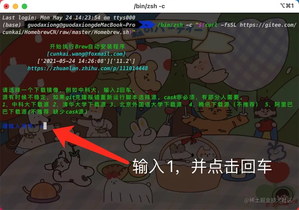 在输入1,并点击回车后,Homebrew就开始自动下载安装了,估计需要几分钟时间。