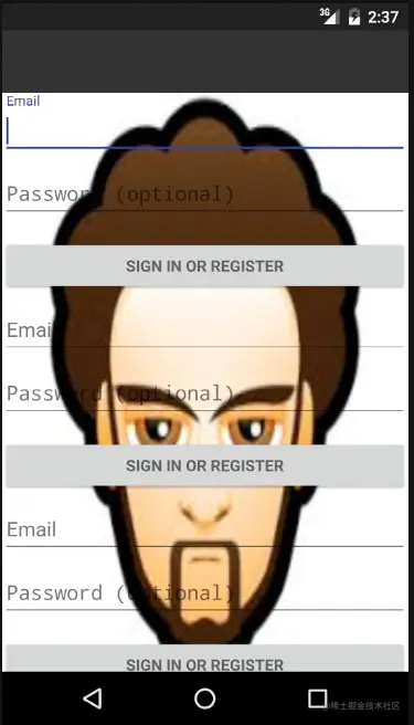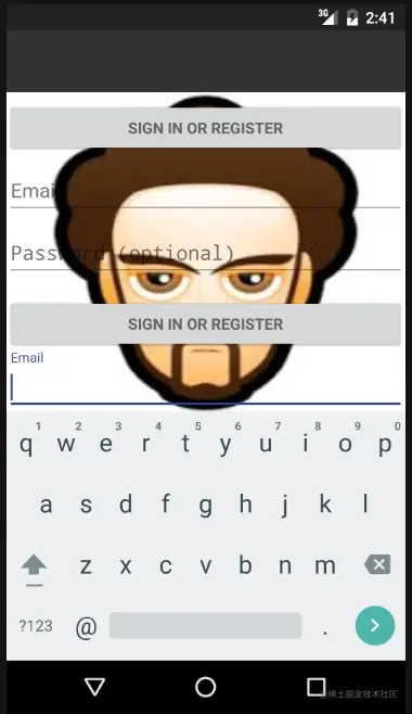 这两次对比,可以得出结论:默认情况下,没有scrollview、listview等控件的界面上,弹出键盘会直接将整个界面原封不动的往上顶,直到可以方便输入;而有scrollview等滚动控件的界面,弹出键盘会压缩这部分可滚动控件,直到可以方便输入。当然并不是只压缩这个滚动控件,而是和它重叠的部分界面都跟着压缩,因为那个背景图片并不是scrollview的背景,而是父控件的。