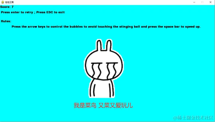 游戏规则:Enter开始游戏,ESC退出游戏,上下左右键按住泡泡移动。躲避随机出现的陨石
