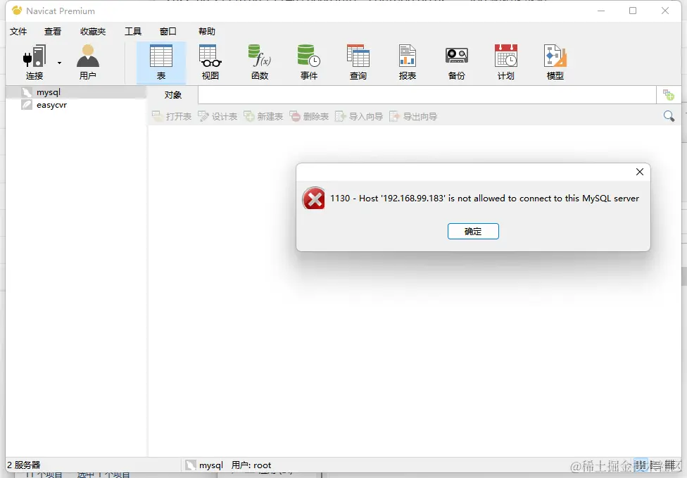 2)根据日志提供的信息(not allowed to connect to this MySQL server),是EasyCVR服务器连接不到MySQL。使用数据库软件测试,查看是否连接不通: