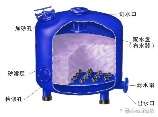 当系统处于过滤状态时,加压水从滤罐进入布水系统,均匀的到达滤料层。当水流过滤料层时,悬浮物被滤料截留。过滤器底部有带缝隙的集水器,过滤后的干净水被均匀收集,并流出过滤器。