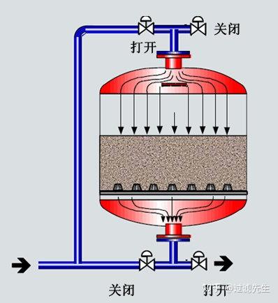 随着杂质在滤料层中不断聚积,压力损失不断增加,当压差增加到某一设定值时或到达设定的清洗时,系统将自动转换至反洗状态。加压水通过集水装置进入滤料层,对其进行冲刷,使截留的污染物脱落并排出过滤系统。反洗持续至少2分钟后,阀门自动将系统转至过滤状态。