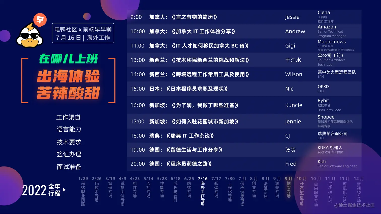 前端早早聊携手 电鸭社区,通过一场全天直播的【海外工作专场】大会,邀请分别在加拿大、日本、新加坡、新西兰、瑞典、德国 6 个国家工作的 11 位伙伴,免费 帮大家答疑解惑,通过他们的视角,看看他们外卷的心路历程、攻略方法、最佳经验。