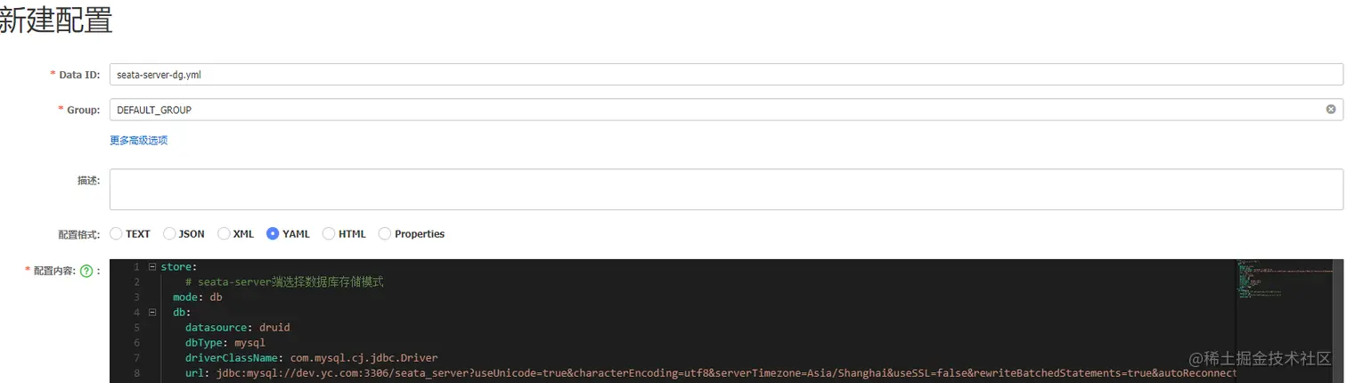 在seata命名空间下新建配置文件seata-server-dg.yml。