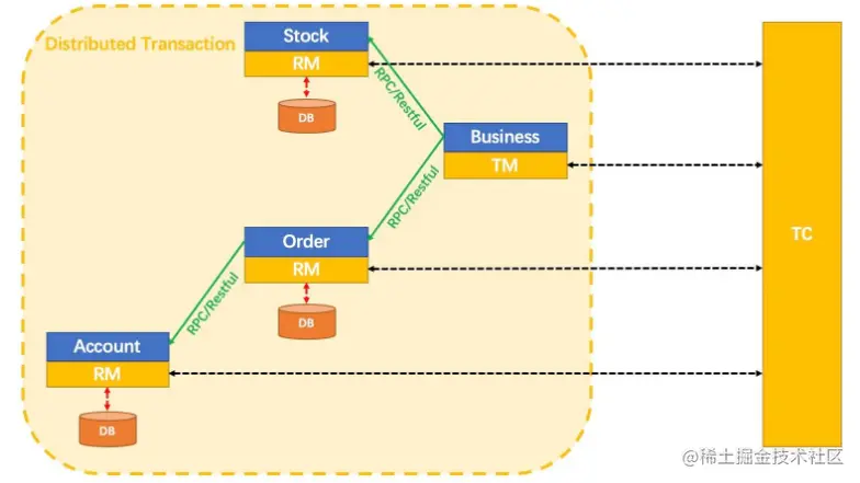 TM和RM(Client端)由业务系统集成。TM为发起服务调用的微服务,理解为聚合服务方。RM为服务被调用方的微服务,理解为下级服务提供方。