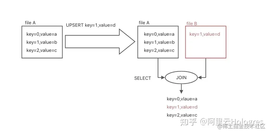 这种方式没有写放大,但是在查询时需要将数据文件和对应的delta文件做join操作。