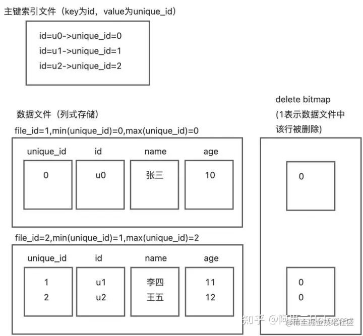 - 第三种是delete bitmap文件,每个file id对应一个bitmap,bitmap中第N位为1表示file id中的第N行标记为删除。delete bitmap在列存模型下,相当于是表的一列数据。Update时只刷新bitmap信息既保留了Merge on Write对查询性能几乎零破坏的优点,又极大降低了IO的开销。