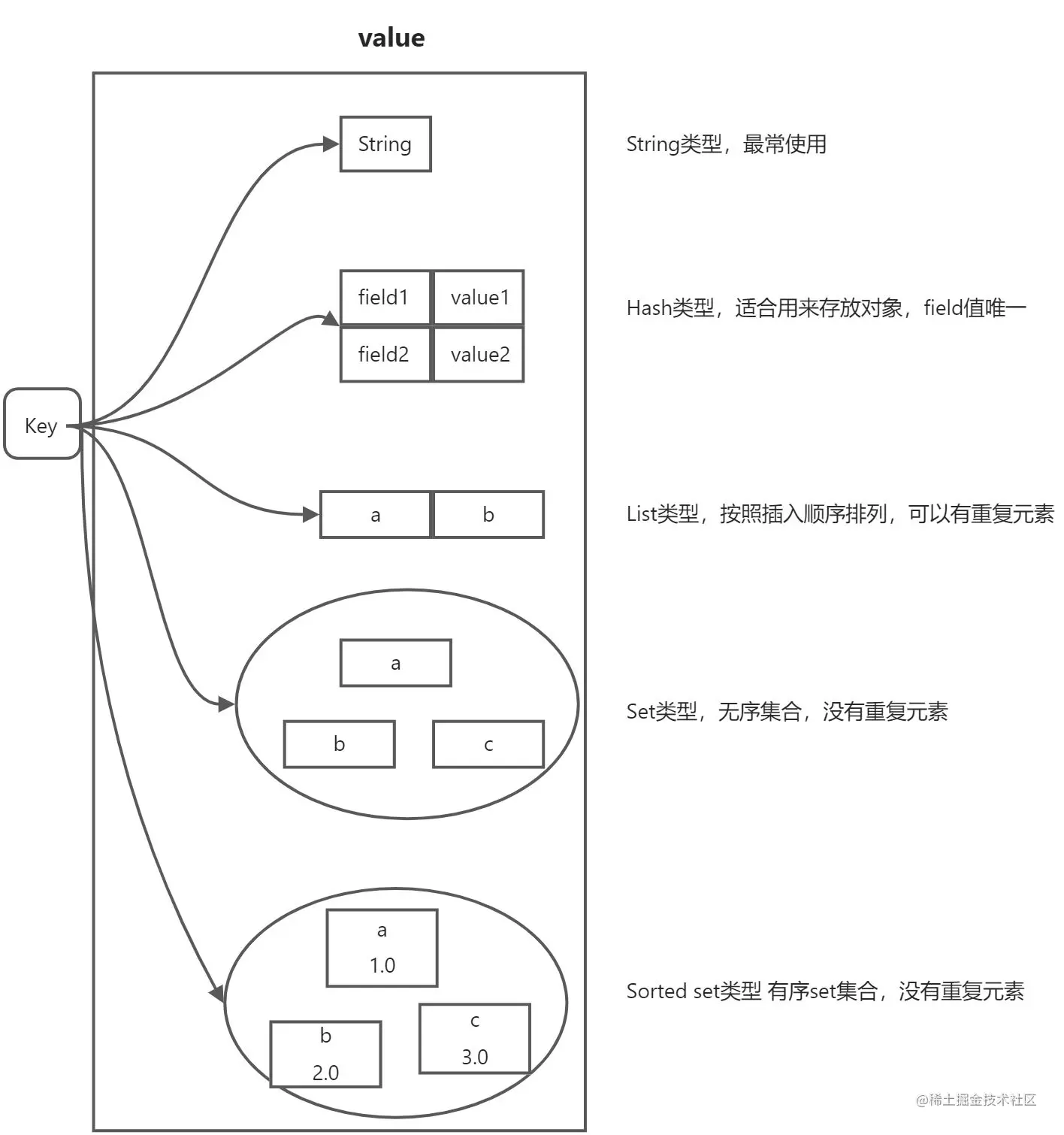 Redis存储的是key-value结构的数据,其中key是字符串类型,value有5种常用的数据类型: