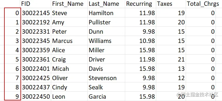 这个例子设置index=False ,当写到CSV文件时,忽略索引值。如果这被设置为 **index=True**,文件就会显示一个索引列,如下图所示。