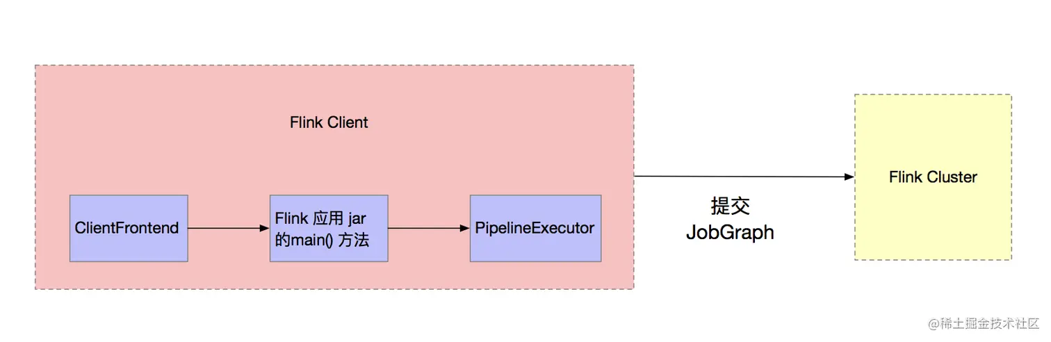- 在 FLink Client 中通过反射启动 Jar 中的 main 函数,生成 Flink StreamGraph、JobGraph,将 JobGraph 提交给 Flink 集群。